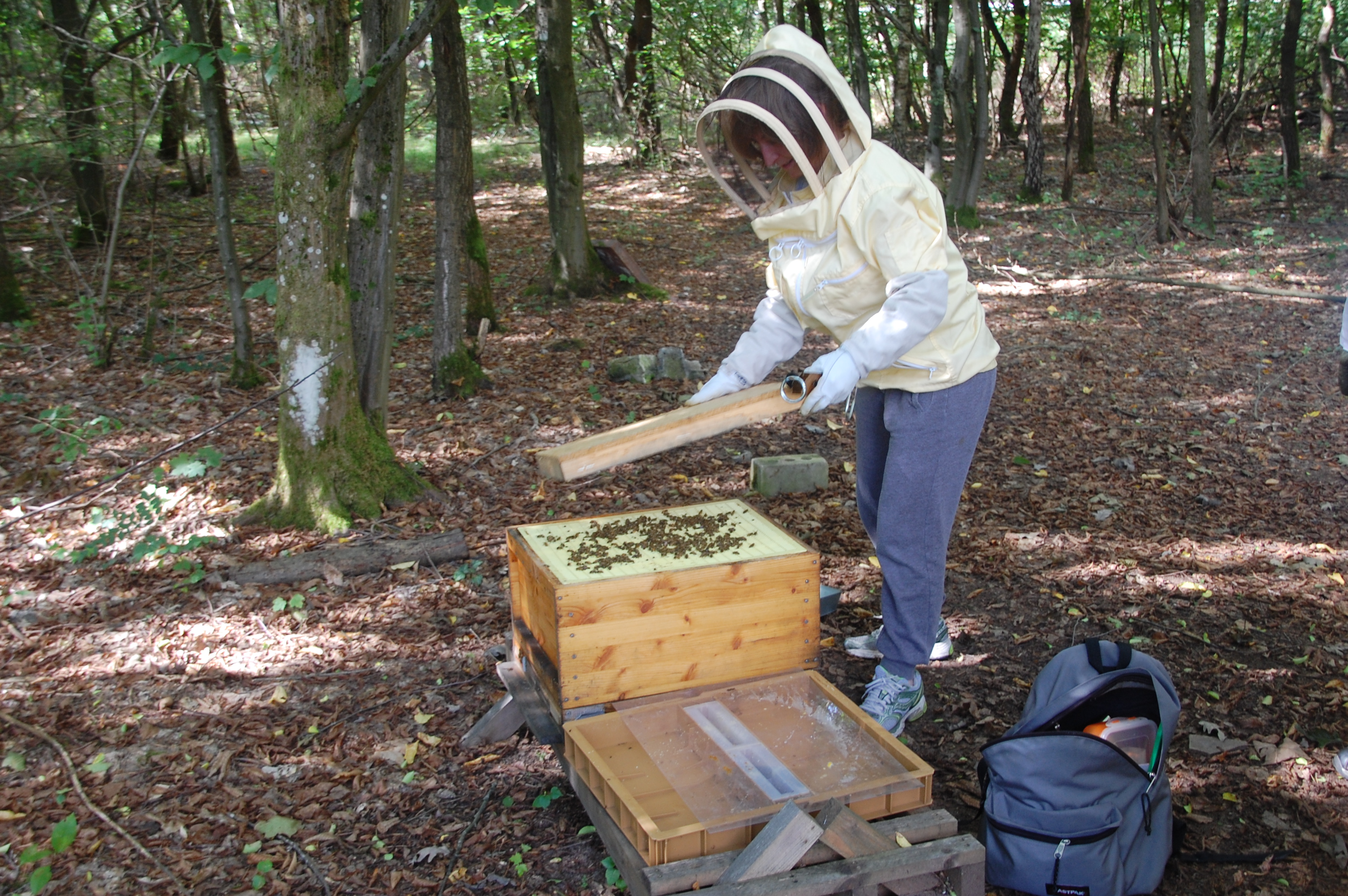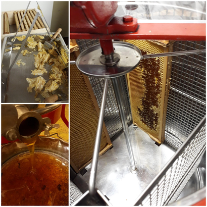Da die Biene den Honig in die Honigwaben einlagert und mit Wachs verdeckelt, musste jede einzelne Wabe von Hand mit der Entdeckelungsgabel entdeckelt werden. Erst dann konnte die Wabe in die Honigschleuder gestellt werden. Zu Beginn schleuderten wir nur leicht an, damit durch das Honiggewicht und die Zentrifugalkraft die dünnen Wachswaben nicht brechen. Der Honig lief erst einmal nur von einer Seite heraus. Dann drehten wir die Waben um und konnten Vollgas geben - nach nochmaligem Wenden wurde nun auch die erste Seite leer geschleudert. Nach ein paar Runden floss unser erster selbst geernteter Honig über ein Sieb in den Honigeimer. Die leeren Waben kamen abends zum Ausschlecken für die Bienen wieder zurück in den Bienenstock. Die Prozedur wiederholte sich dann am nachfolgenden 2. Schleudertag