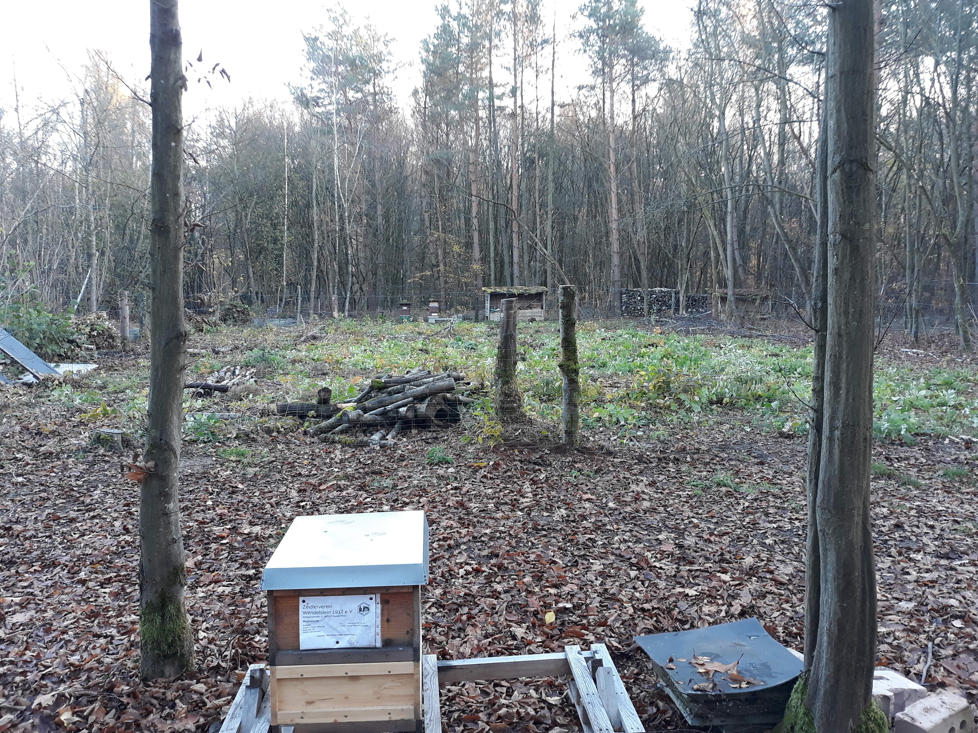 Anfang 2020, in der Zeit vor Corona, wurde – nach Beschluss des vorherigen Vorstands – eine Teilfläche am Lehrbienenstand gerodet, um mehr Licht für die Bienenvölker und Kurse zu erhalten.